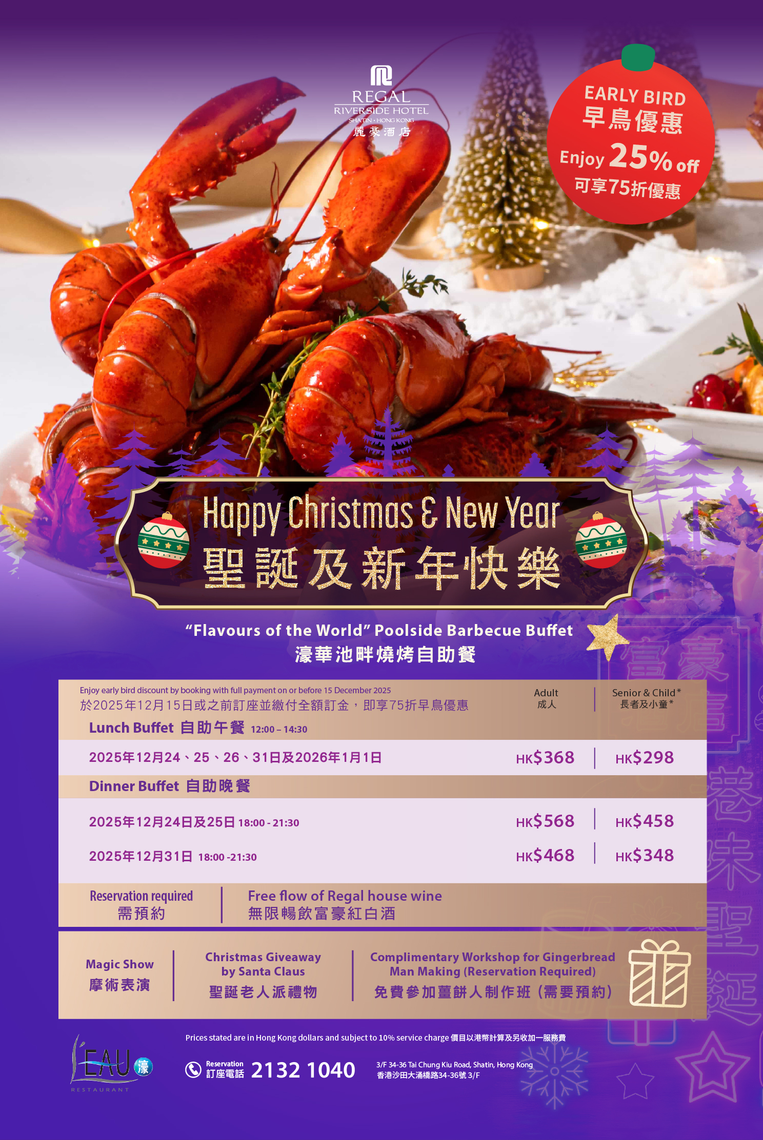 濠餐厅 -「百变龙虾」.国际美食池畔烧烤自助餐 意廊-圣诞意大利巡礼半自助晚餐 仙 -圣诞银车海鲜.烤肉半自助晚餐 |